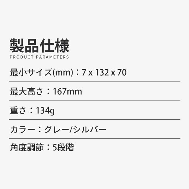 - デザイン、シルバー色、袋付きと大変満足!安定感が良く角度調整、特に高さ調整は充電端子が下にある機種は非常に便利!