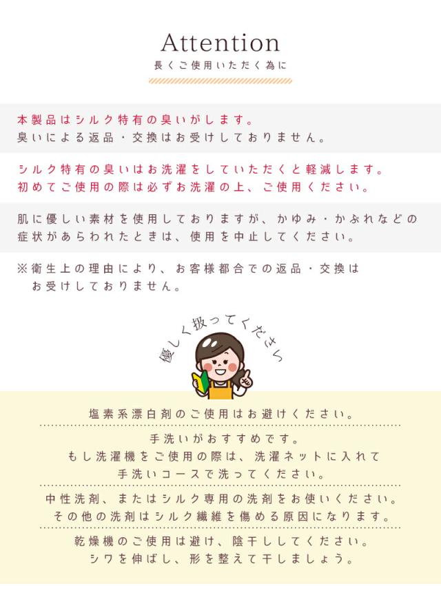 | 注意事項 | ●お肌に合わない場合や、湿疹・傷・かぶれ等のある場合、かゆみ等がでた場合はご使用にならないでください。 ●火気のそばや高温多湿な場所、直射日光の当たる場所には保管しないでください。 ●本来の目的以外でのご使用はおやめください。 ●生地部分に爪を立て、無理に引っ張ると破れるおそれがあります。着脱の際はご注意ください。 ●天然素材を使用しておりますので、シルクの特有の匂いがする場合がございます。 匂いによる返品・交換はお受けしておりません。匂いが気になる場合はお洗濯の上、ご使用ください。 |
