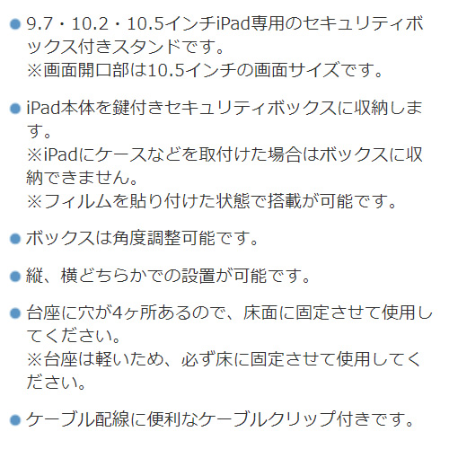 デジタルサイネージなどに最適なiPad用セキュリティボックス付きロースタンド。 ■サイズ:W312×D237×H332mm ■重量:3kg ■材質: 収納ボックス・台座/スチール(エポキシ樹脂粉体塗装)、 支柱/アルミ ■付属品:鍵×2個(1種類)、木ネジ、インサートナット ■対応機種:Apple 9.7インチiPad2018/2017、9.7インチiPad Pro、iPad 10.2インチ(第7世代)、iPad Air(2019)、10.5インチiPad Pro 2017 ※記載は商品仕様の一部です。仕様説明不足等の理由での返品はできません。特に適合等は必ずご確認ください。