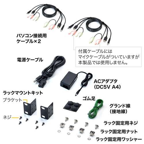 | セット内容 | 本体×1、ACアダプタ(DC5V 4A)×1、電源ケーブル×1、パソコン接続用ケーブル(1.8m)×2、 ラックマウントキット(ブラケット×2、ネジ×6)、グランド線(接地線)、取扱説明書(保証書付き)、 ゴム足×4、ラック固定用ネジ×4、ラック固定用ナット×4、ラック固定用ワッシャー×4 |