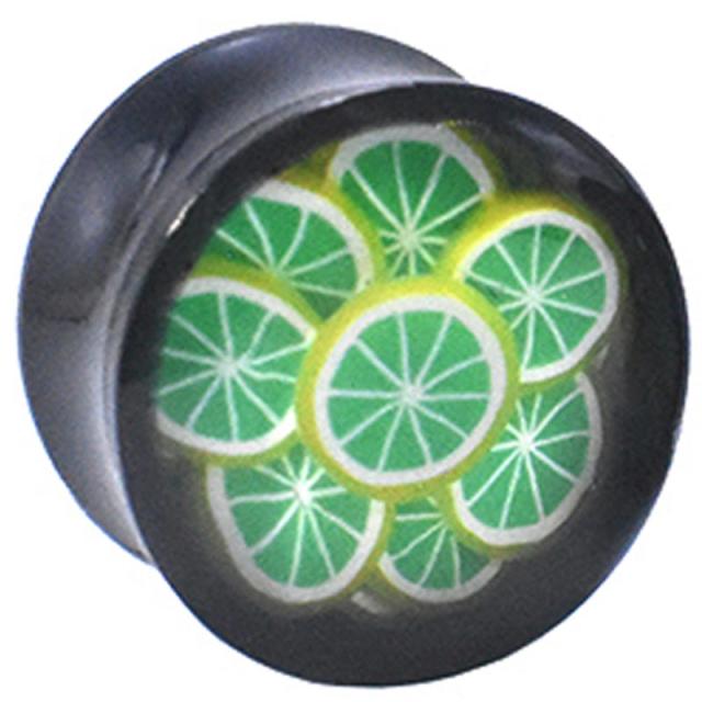 [ボディピアス アクリル ダブルフレア ] フルーツアクリルプラグ (ライム) ボディーピアス 0G 0ゲージ 00G 00ゲージ 12mm 12.0mm 12ミリ ハーフインチ メンズ レディース プラスチック プラスティック 黒色 果物 面白い オモシロ 可愛い レモン 檸檬 柑橘類