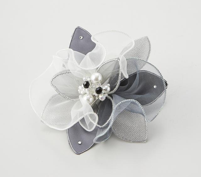 ふんわりとした印象で落ち着いたモノトーンの繊細なコサージュ。