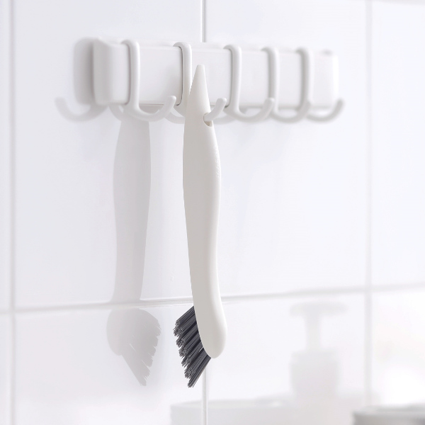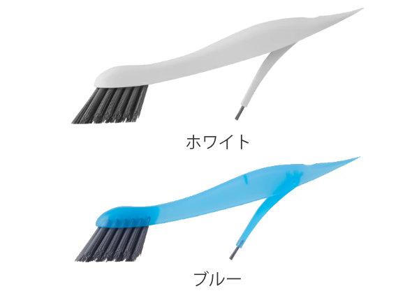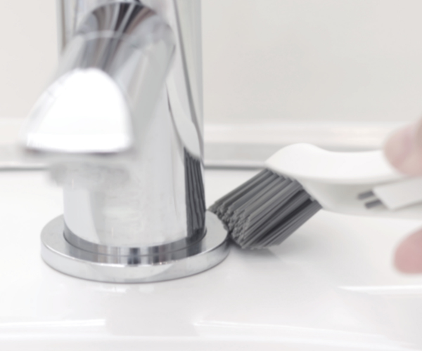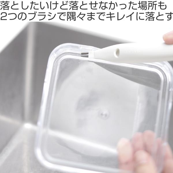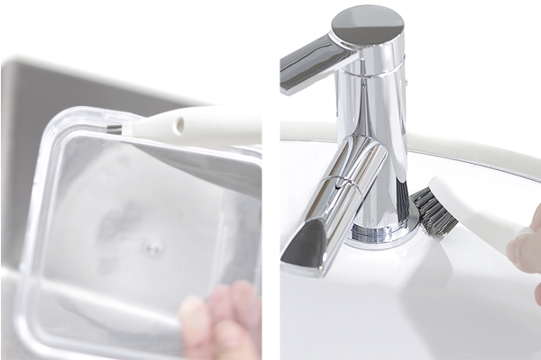 2つのブラシとスクレーパーで、蛇口・サッシ・弁当箱の溝など、複雑な形や細かい場所の汚れをすみずみまで落とします。