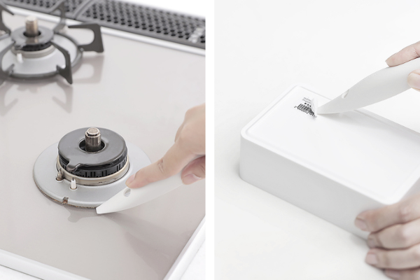 ブラシの後部に付いているスクレーパーがコンロ周りのこびりついた汚れなど、シールはがしなどにお使い頂けます。