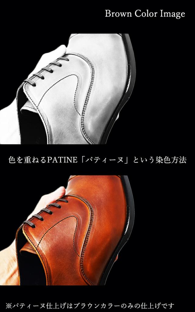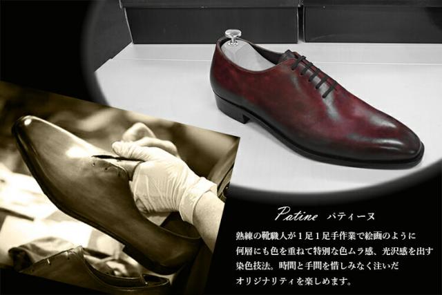 自社生産 ファクトリー で パティーヌ ( 染色 )加工を施した 牛革日本製シューズ 。