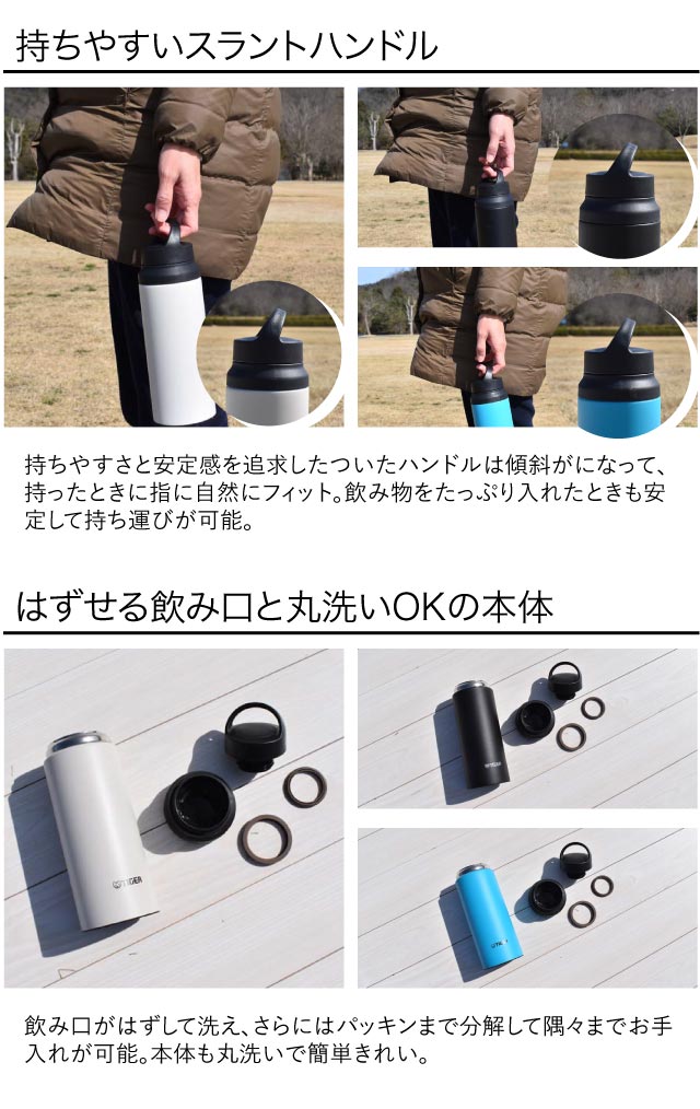 持ちやすさと安定感を追求した「スラントハンドル」は傾斜が指に自然にフィット。飲み物をたっぷり入れたときも安定して持ち運ぶことができます。