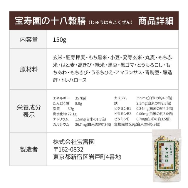 原材料:玄米・胚芽押麦・もち黒米・小豆・発芽玄米・丸麦・もち赤米・はと麦・高きび・緑米・黒豆・黒ゴマ・とうもろこし・もちあわ・もちきび・うるちひえ・アマランサス・青豌豆・醸造酢・トレハロース