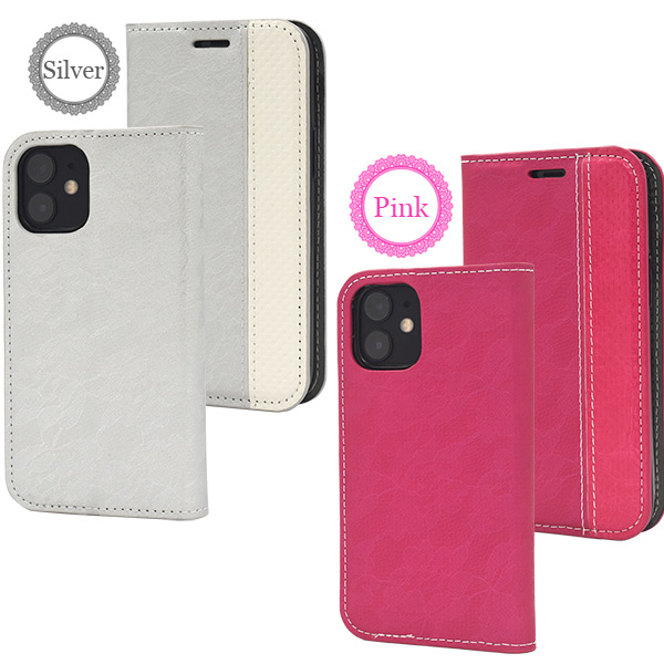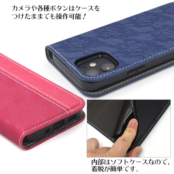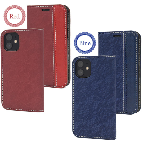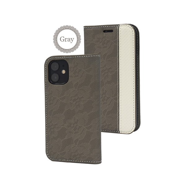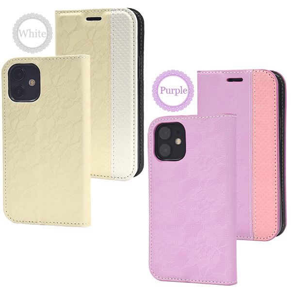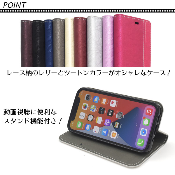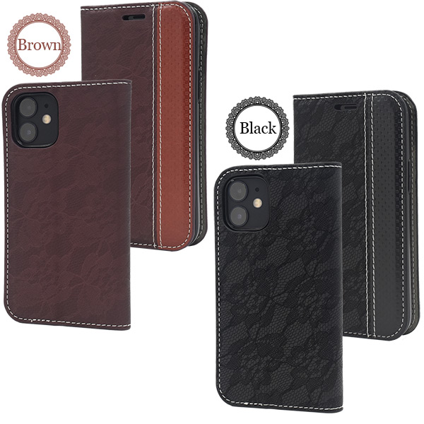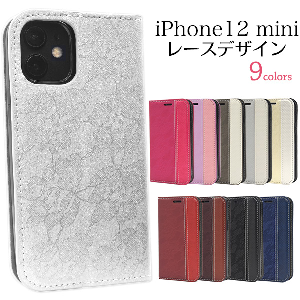 iPhone 12 mini用 レースデザイン手帳型ケース