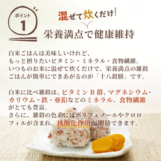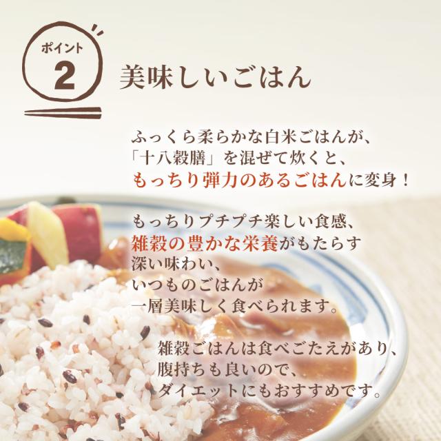 いつものお米に混ぜて炊くだけで、栄養満点の雑穀ごはんが簡単にできあがるのが「十八穀膳」です。