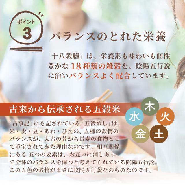 「十八穀膳」は、栄養素も味わいも個性豊かな18種類の雑穀を、陰陽五行説に沿いバランスよく配合しています。