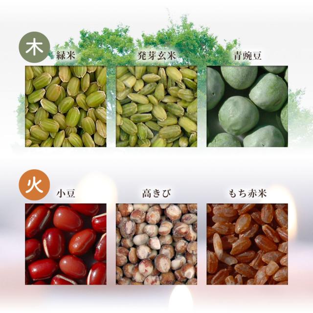 「古事記」にも記されている「五穀めし」は、米・麦・豆・あわ・ひえの、 五種の穀物のバランスが、太古の昔から長寿の食物として重宝されてきた理由なのです。相互関係にある 五つの要素は、お互いに消しあって全体のバランスを保つと考えてられている陰陽五行説。