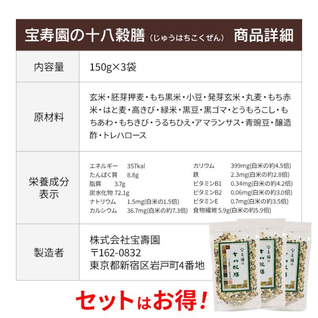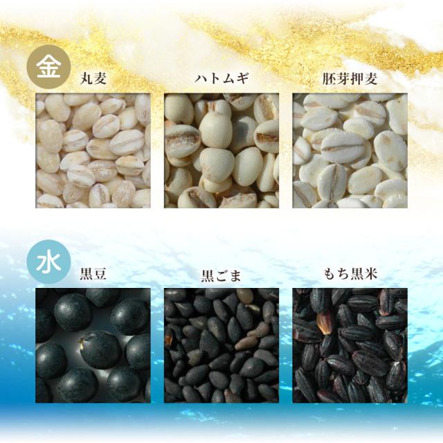 原材料:玄米・胚芽押麦・もち黒米・小豆・発芽玄米・丸麦・もち赤米・はと麦・高きび・緑米・黒豆・黒ゴマ・とうもろこし・もちあわ・もちきび・うるちひえ・アマランサス・青豌豆・醸造酢・トレハロース