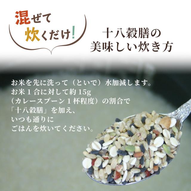 お米1合に対して約15g(カレースプーン1杯程度)の割合で「十八穀膳」を加え、いつも通りにごはんを炊いてください。