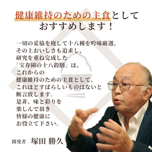 一切の妥協を廃して十八種を吟味厳選、その上おいしさも追求し、研究を重ね完成した「宝寿園の十八穀膳」は、これからの健康維持のための主食として、これほどすばらしいものはないと断言致します。