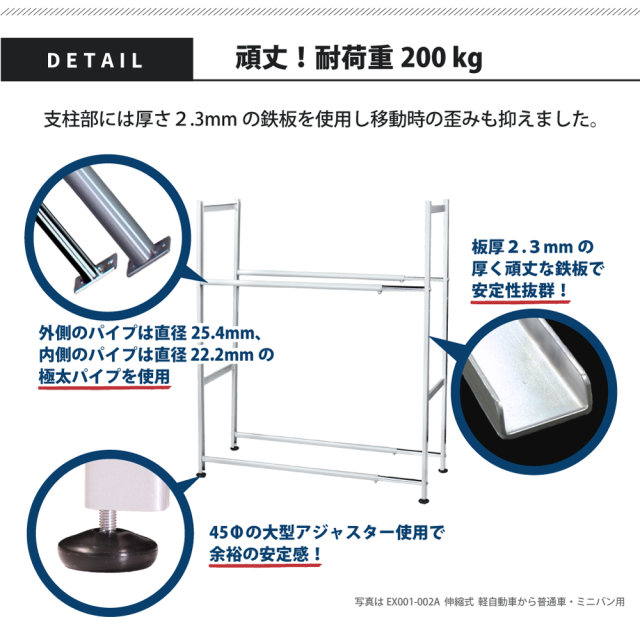 場所を取る2台分のタイヤをこれ1台にスッキリ収納。 シーズンオフのタイヤを立てて収納可能。タイヤラックカバーもかけて収納すれば、 タイヤの劣化の原因となる紫外線や水分、汚れなどを防げます。 伸縮タイプはタイヤの幅や設置場所に合わせて自由に可動します。 無駄な隙間を作らずスペースを有効活用、収納したタイヤの横倒れ防止にもなります。 支柱部には厚さ2.3mmの鉄板を使用し、移動時の歪みを抑えました。 直径45mmの大型アジャスターを使用で余裕の安定感。 材料から国内産を使用するこだわりで、品質と機能は他製品と一線を画します。 車種や置き場に合わせて3タイプから選べます。 EX001-002A;タイヤ外形74cmまで(参考:ノア、65.2cm(205/60R16)マークX、66.9cm(235/45R18)) タイヤラック・伸縮サイズ 軽自動車から普通車用 |