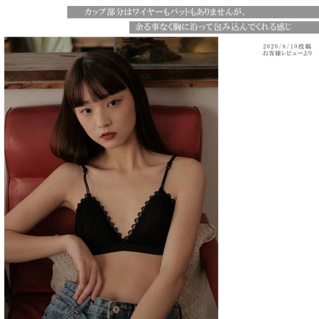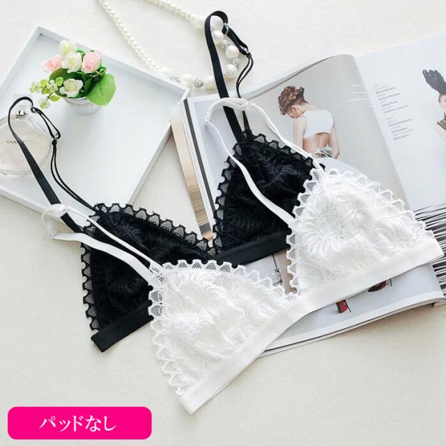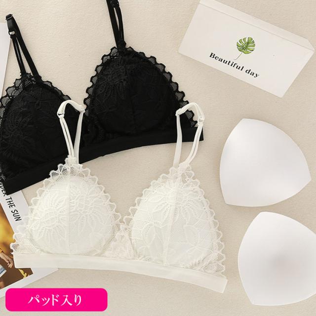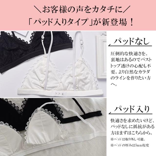 | 特徴 | パッド入りとパッドなしと選べる2種類! ノンワイヤー、三角ブラ、シンプルなレースデザイン シンプルで可愛い系ブラなので、中学生や高校生の下着としてもおすすめです! |
