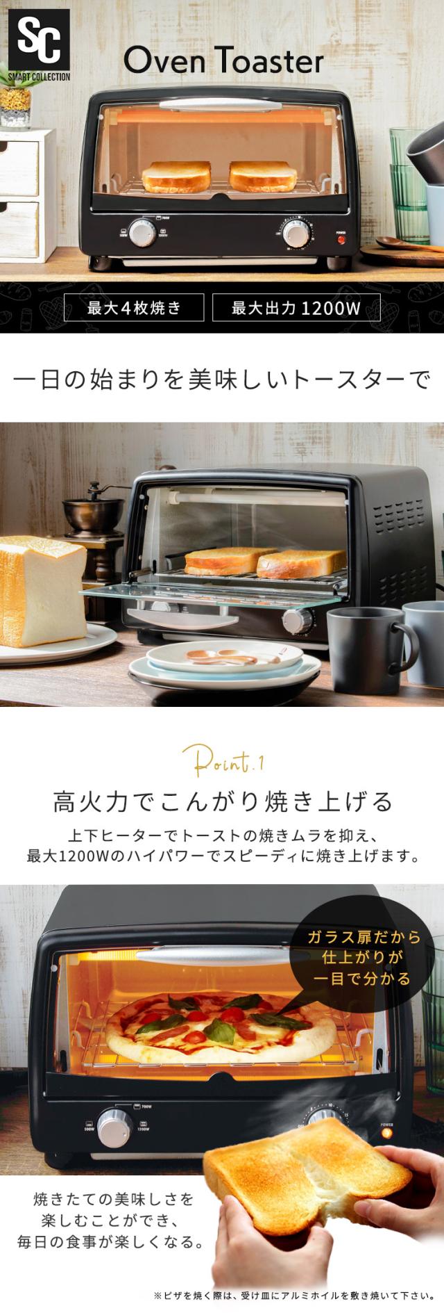 オーブントースター 4枚 4枚焼き トースター 最大1200W 上下ヒーター 焼きムラ少ない 火力調節 3段階 タイマー 最長30分 広々庫内 受け皿 パンくずトレー付 お手入れ簡単 食パン トースト ピザ グラタン 餅 クッキー 新生活 POT-412R-B *