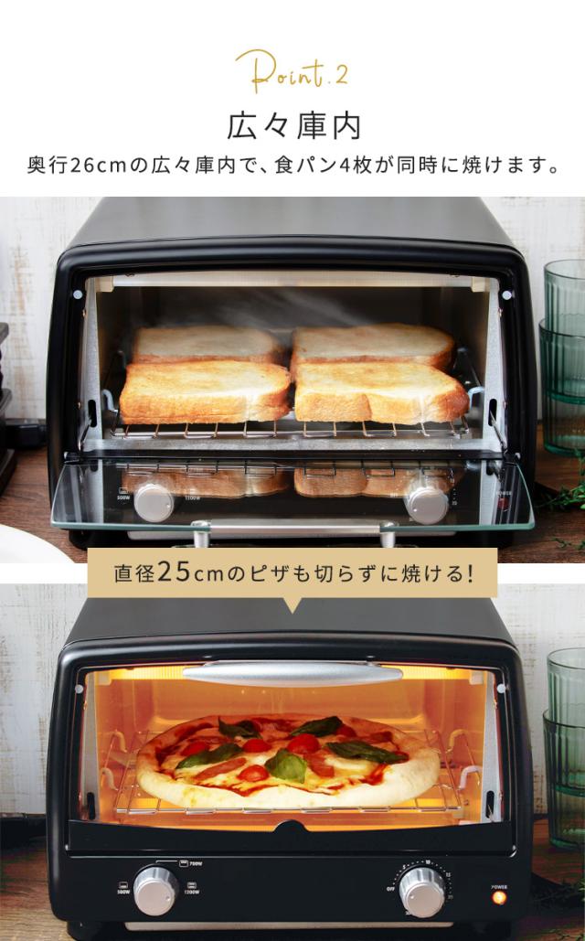 見やすいガラス扉で焼き上がりが一目瞭然、奥行26cmの広々庫内で食パン4枚が同時に焼けます。