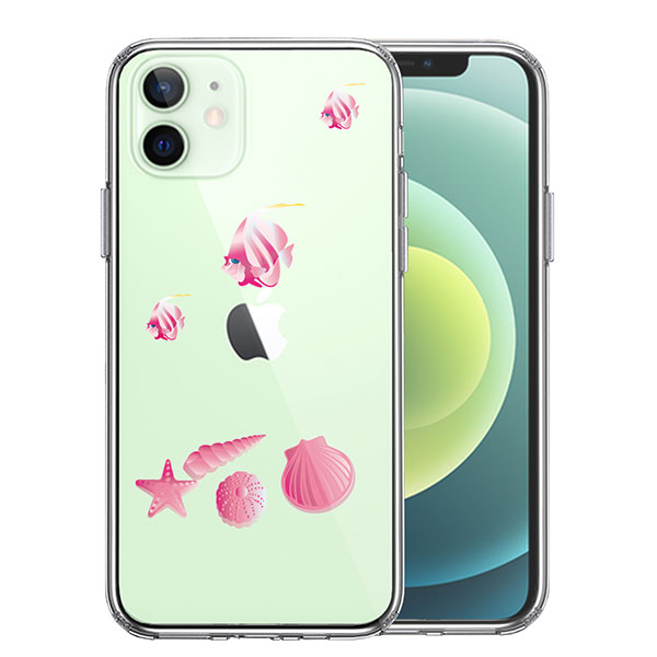 iPhone12mini ケース ハードケース ハイブリッド クリア 夏 熱帯魚 と 貝 ピンク カバー アイホン アイフォン スマホケース