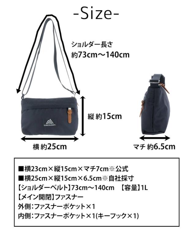 | サイズ(約) ※当店実寸値 | 公式サイズ 横23cm×縦15cm×マチ7cm 自社採寸サイズ 横25cm×縦15cm×6.5cm 【ショルダーベルト長さ】73cm〜140cm 【容量】1L | ||