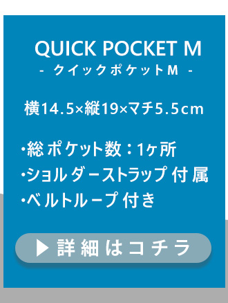 手元に置いておきたい携帯電話やカメラを収納するのに最適なショルダーポーチとして人気の『クイックポケット』のLサイズ(3L)。