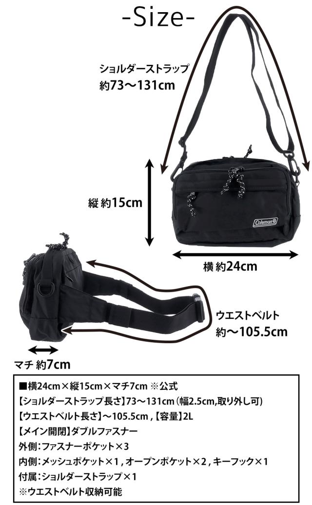 | サイズ(約) ※当店実寸値 | 公式サイズ 横24cm×縦15cm×マチ7cm 【ウエストベルト】〜105.5cm 【ショルダーベルト】73〜131cm(幅2.5cm、取外し可) 【容量】2L | ||