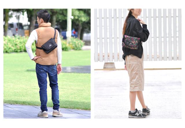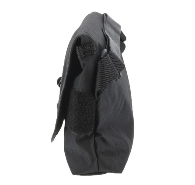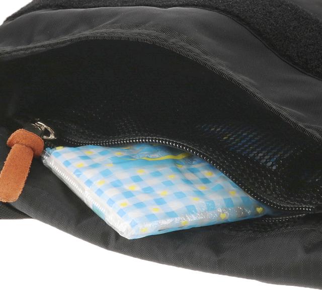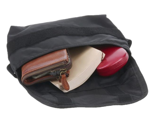 バッグの開口部はマジックテープのフラップ式で、中の荷物をしっかり守ります。また、A5サイズ対応の本体部分はパッド付きなので、スマートフォンや機器類の収納も安心です。
