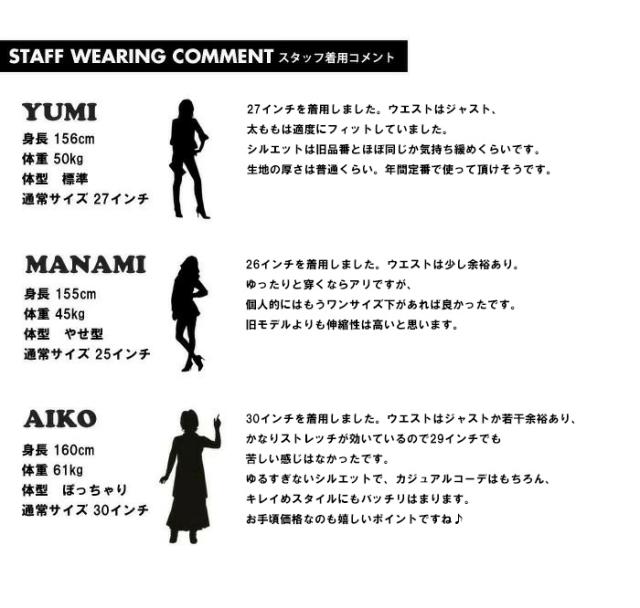 | 素 材 | ストレッチデニム 綿66% ポリエステル20% レーヨン11% ポリウレタン3% ストレッチサテン 綿68% ポリエステル29% ポリウレタン3% |