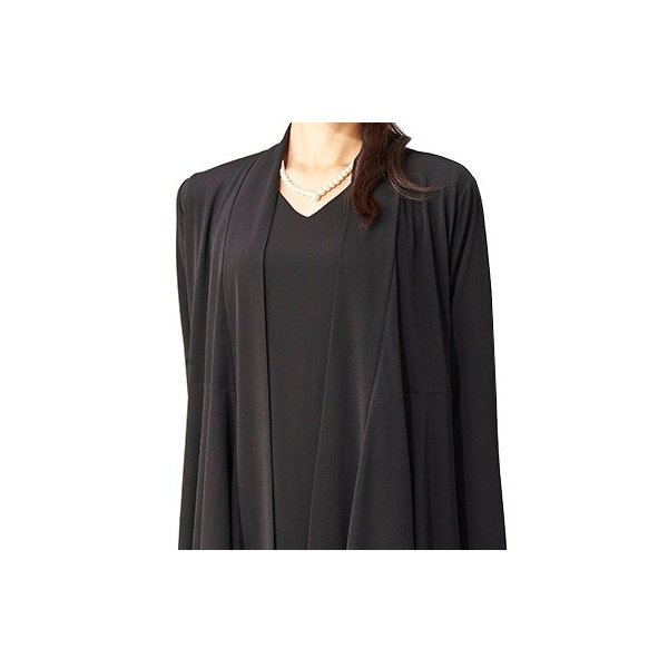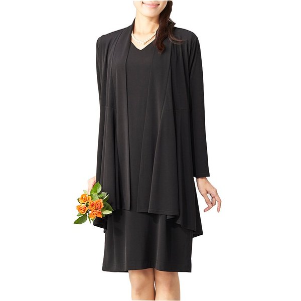 きれいなライン、落ち感のあるニット生地で作られた、楽に着られてきちんと感も出るワンピースに、ロング丈のジャケット付き。
