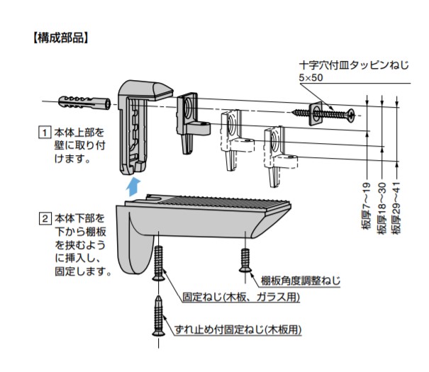 | 棚受 IT7033-51 上下 角度調整機能付 板厚調節プレートの位置を変えることで、板厚7〜 41mmに適応します。 最大2度の角度調整ができます。 【付属品】 プラグ 十字穴付皿タッピンねじ5x50 【構成部品】 【1】本体上部を壁に取り付けます。 【2】本体下部を下から棚板を挟むように挿入し、固定します。 【材料】 【1】本体:亜鉛合金(ZDC) 【2】パッキン:ポリアミド(PA) 【3】板厚調整プレート:亜鉛合金(ZDC) 【仕上】 【1】本体:ステンレス調 【2】パッキン:クリアー 【3】板厚調整プレート:素地 【サイズ】 適応板厚: 7〜 19、18〜 30、29〜 41 h: 10.5、21、31.5 棚奥行:320以下 【耐荷重N】 490 /2ヶ 【耐荷重kgf】 50 /2ヶ 【重量】 698g 輸入品のため「寸法・色調・作動感のばらつき」や、予告なく仕様変更等を行う場合があります。 製品内容は、部品としての品質範囲です。この部品を使用した最終製品の機能・性能・安全を保証するものではありません。 【注文コード】 120-014-885 【品番】 IT7033-51 ※画像はイメージです。 ※パッケージ、仕様、品番などの変更が予告なく変更される場合が御座います。 カテゴリー |