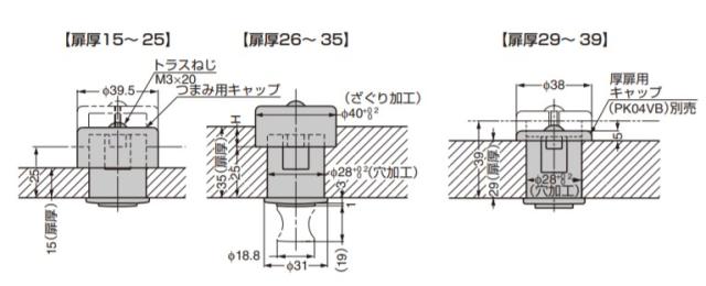 ざぐり深さH:扉厚15〜 25:H=0(直径28貫通穴)、扉厚26〜 35:H=扉厚—25(扉裏面)