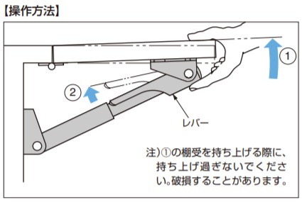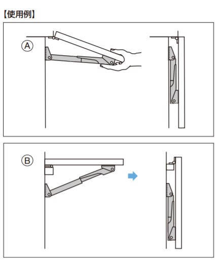 | 伸縮 棚受 388型 不用な時は簡単に折りたためるため、空間を有効に利用できます。 耐荷重に優れた棚受で、図面矢印の荷重位置で25 kg 〜 36 kgまで使用可能です。 アルミニウム合金製のため軽量です。 【推奨使用数】 棚板の横幅600 mm以下の場合は1本、それ以上1,300 mm位までは2本使いをお奨めします。 【注 意】 伸縮操作は常に棚板を持ちながら行ってください。棚板を持たずに棚受単体だけを操作、操作しにくい用途・場所での使用、本品への負荷、およびレバーのロック部分を持ちながらの操作は、思わぬケガや破損の原因となる場合があります。 ロックまたは解除する場合、棚板をフラットな位置から少し上に持ち上げるための遊びが必要です。 標準板厚15mm 〜 35mm用です。 耐荷重は下図矢印の荷重位置で力を加えた場合を表します。丁番、木ねじ、取付部の強度などにより変化することがあります。取り付けの際は仕様を十分ご確認ください。 38820-25及び38820-25-BLは使用例Bのような使用方法はできません。 【操作方法】 注)【1】の棚受を持ち上げる際に、持ち上げ過ぎないでください。破損することがあります。 【材料】 アルミニウム合金 【仕上】 アルマイト処理 【サイズ】 A:B:C:D:E 28〜 50:402:87:258.5:430.8 【耐荷重N】 330 /1本 【耐荷重kgf】 33 /1本 【重量】 266g 輸入品のため「寸法・色調・作動感のばらつき」や、予告なく仕様変更等を行う場合があります。 製品内容は、部品としての品質範囲です。この部品を使用した最終製品の機能・性能・安全を保証するものではありません。 【注文コード】 120-105-062 【品番】 38845-25 ※画像はイメージです。 ※パッケージ、仕様、品番などの変更が予告なく変更される場合が御座います。 カテゴリー |
