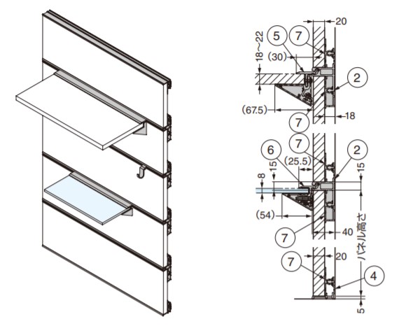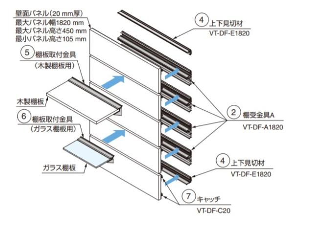 | 調整付棚受システム VT-DS型/調整付棚受システム VT-DF型トレイ 脱落防止機構付 上下差込パネル仕様 PAT/脱落防止機構付 正面取付パネル仕様 PAT 対応部品に新しく、平プレート、トレイ、フックが加わりました。 平プレートはお客様で必要な長さにカットしてご使用ください。使用例はVTJ2000 をご覧ください。 高耐荷重タイプの調整付棚受システムです。 壁面を利用したオープン感覚のハンギングディスプレイシステムです。 棚のレイアウト変更や脱着が自由にできます。 キャッチ機構により、施工後もパネルを正面から自由に取り外すことができるため、レイアウト変更や模様替えが簡単にできます。 パネル裏面に配線を通せます。照明やAVとの組み合わせも大変便利です。 従来の壁面棚に比べ、棚が脱落しにくい棚脱落防止機構付きです。 棚は木棚とガラス棚があり、目的やデザインに合わせて自由にレイアウトできます。 【注 意】 調整付棚受システムVT型と互換性はありません。 パネル、木製棚板、ガラス棚板は付属しておりません。別途ご用意ください。 棚板取付金具にエンドキャップを2ヶ付けると、幅は7mm伸びます。 【材料】 アルミニウム合金 【仕上】 シルバーアルマイト処理 【サイズ】 長さL:2000 適応壁面パネル厚:- 適応棚板(幅:-、奥行:-、厚さ:-) 【耐荷重N】 98 ※耐荷重は棚板自体の質量は含んでいません。 【耐荷重kgf】 10 ※耐荷重は棚板自体の質量は含んでいません。 対応型式 VT-DS:VT-DF ○:○ 製品内容は、部品としての品質範囲です。この部品を使用した最終製品の機能・性能・安全を保証するものではありません。 【注文コード】 130-036-350 【品番】 VT-D-K350 ※画像はイメージです。 ※パッケージ、仕様、品番などの変更が予告なく変更される場合が御座います。 カテゴリー |