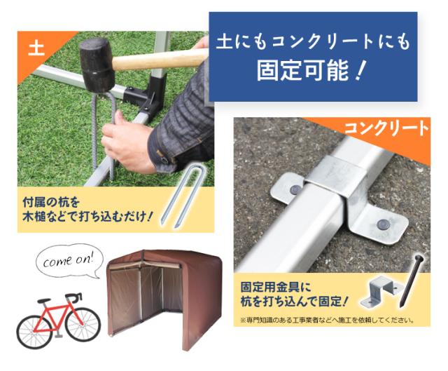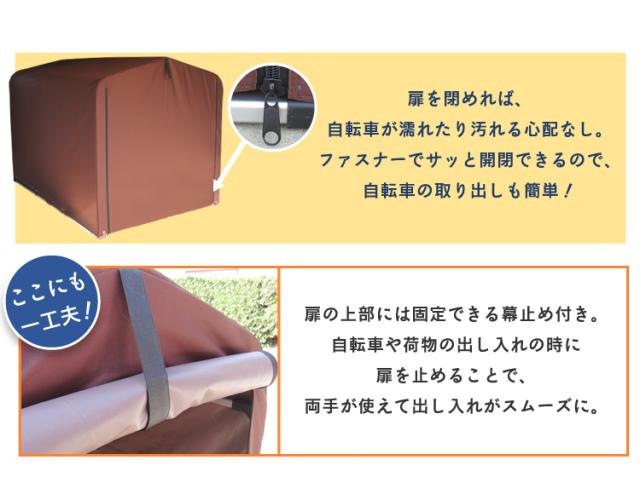 扉を閉めれば自転車が濡れたり汚れる心配なし、上部には固定できる幕止め付き。