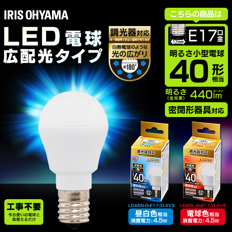 LED電球 E17 広配光タイプ 調光器対応 40W形相当 昼白色・電球色 LDA5N-G-E17/D-4V3 アイリスオーヤマ
