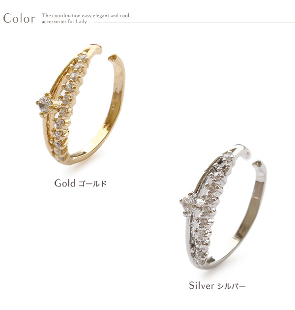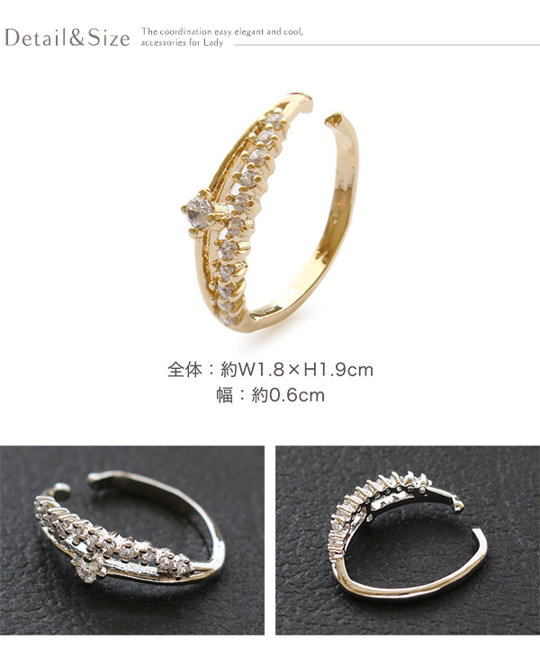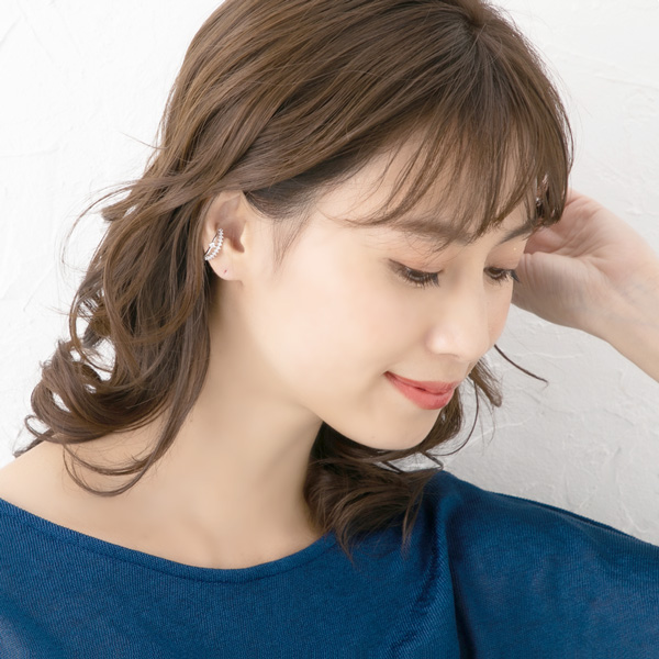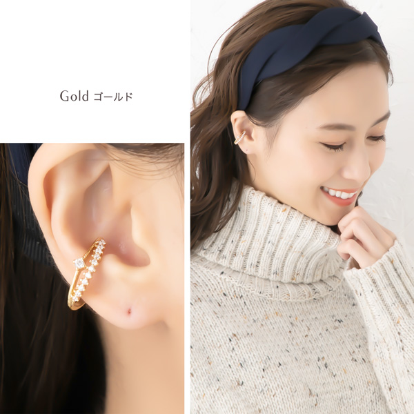 | 耳の上部と軟骨部分を挟むように引っ掛けるウェアリング(イヤーカフ)です。 キラキラと煌めくキュービックジルコニアが耳元に映え上品な輝きでコーデを引き立てます。 ノンホールの方でも気軽に耳元のオシャレが楽しめます! | |