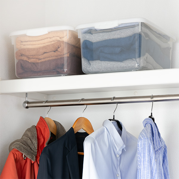 クローゼットの棚上に収まるサイズです。厚手の服なら約3〜4枚、薄手の服なら約5〜6枚収納可能です。