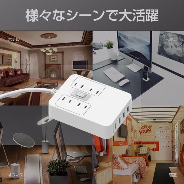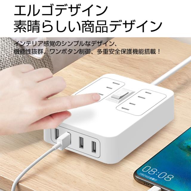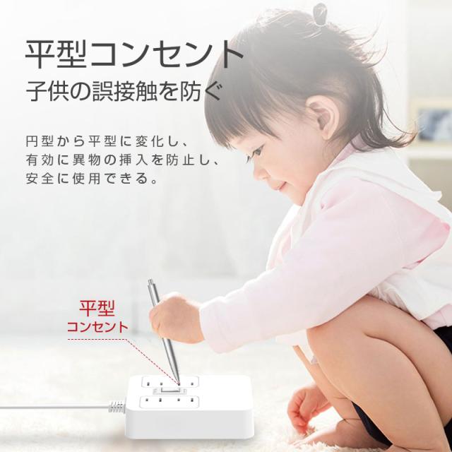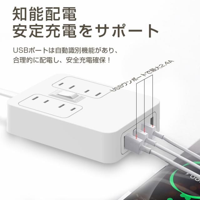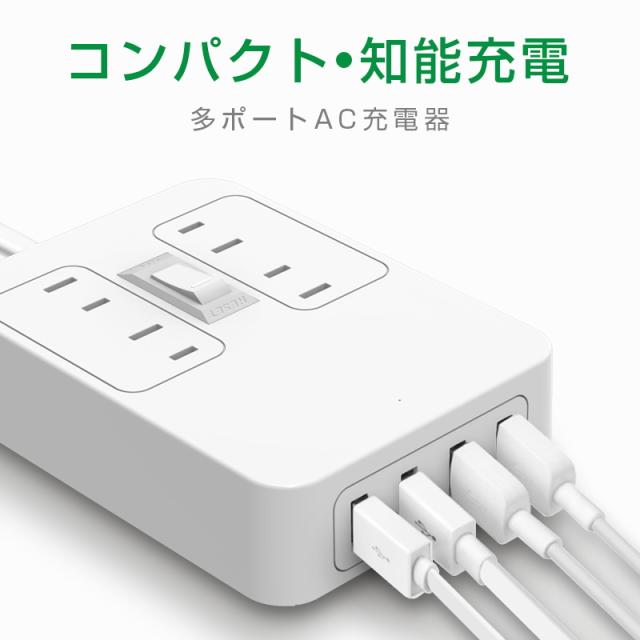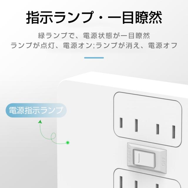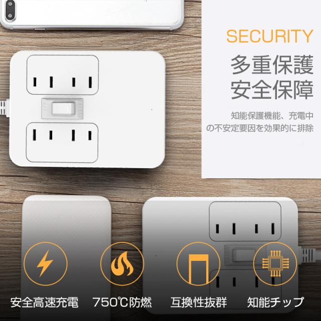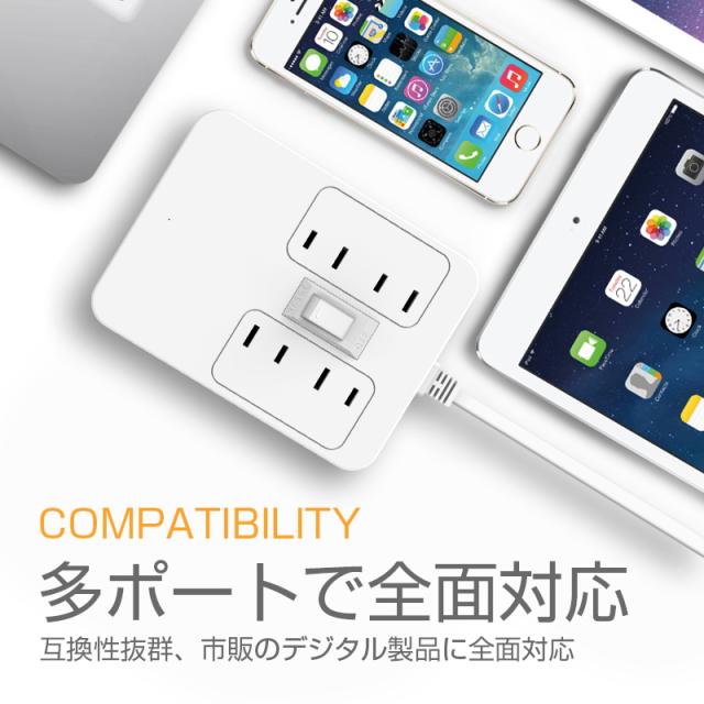 【急速充電対応】最大2.4Aの出力に対応できて、従来の2A出力より速いスピードで充電可能です。スマホだけでわなく、タブレットやノートパソコン等も急速充電対応できます。互換性に優れて、充電スピードも速い高品質な電源タップです。