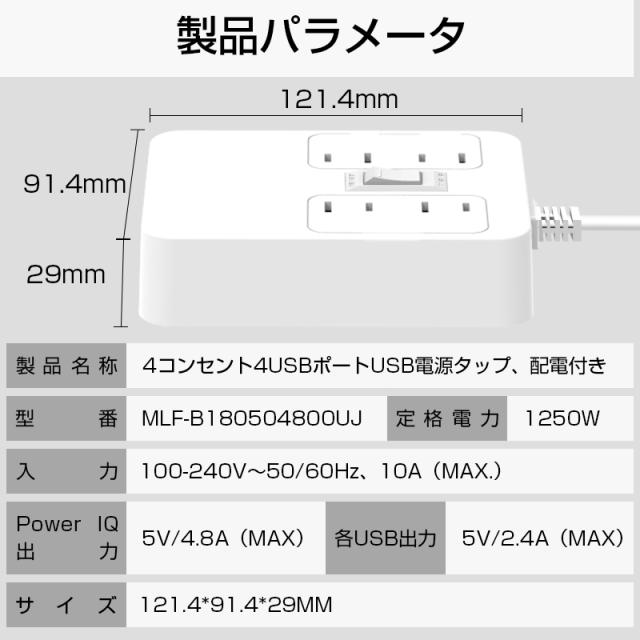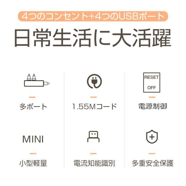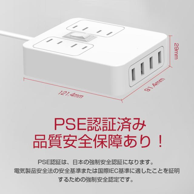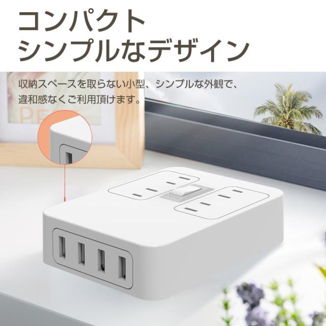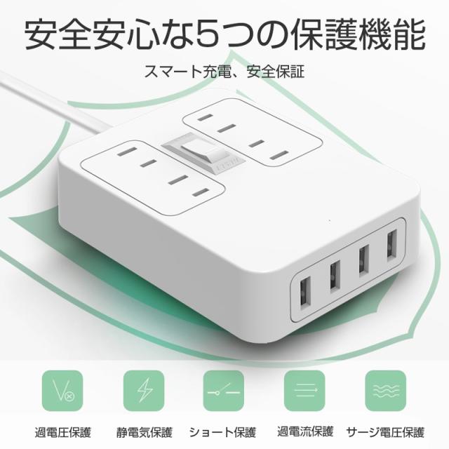 電源タップ USBコンセントiPhone17シリーズ iPhone17/Air/17pro/17promax 2極コンセント 感電防止 節電タップ1250W 2.4A 一体式 4口ACコンセント 4口USBポート 難燃素材 【PL保険加入済み製品・安心】