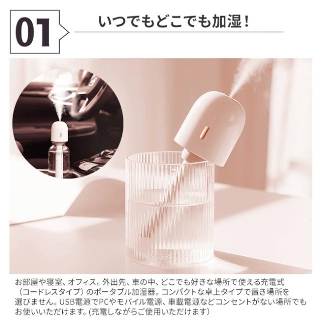 お部屋や寝室、オフィス。外出先、車の中、どこでも好きな場所で使える充電式(コードレスタイプ)のポータブル加湿器。コンパクトな卓上タイプで置き場所を選びません。