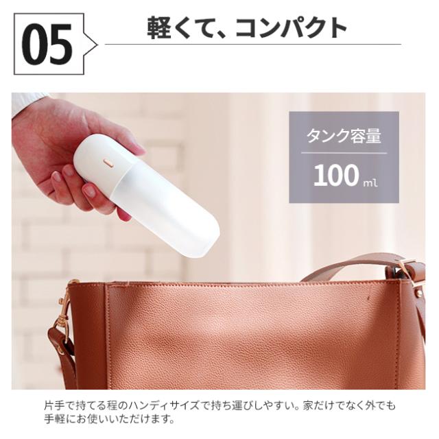 お部屋や寝室、オフィス。外出先、車の中、どこでも好きな場所で使える充電式(コードレスタイプ)のポータブル加湿器。コンパクトな卓上タイプで置き場所を選びません。 軽くてコンパクト。片手で持てる程のハンディサイズで持ち運びもラクラク。家だけでなく外でも手軽に使いたいという方にオススメです。 やわらかく、肌触りの良い超微細ミストを噴霧。乾燥しがちなお肌や喉、空間をやさしくうるおいます。また超音波式なので触れても火傷の心配がありません。 一度の充電で連続運転なら約3時間、リズム運転なら約5時間使用可能。利用シーンに合わせて運転モードを切り替えられます。 電源を切り忘れても3時間後に自動停止する安心設計。 グラスやお気に入りの容器に水を入れ、スティック部分を水に浸すだけであなただけのオリジナル加湿器に。 スティック部分に付属の延長アダプターとロングタイプの吸水芯をセットすれば、500mlペットボトルなどの背の高い容器でもお使いいただけます。 お休み時にも使いやすい静音設計です。 |