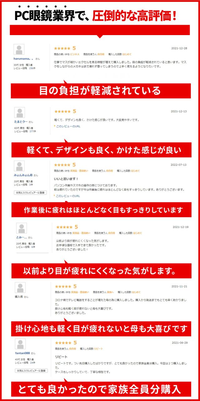 - メガネの色がキレイですし、機能的にも良いです。つけ具合もいいのでオススメです。