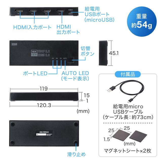 HDMIセレクター 3入力1出力 4K/60Hz HDR HDCP2.2 自動/手動切り替え HDMI切替器[400-SW035]