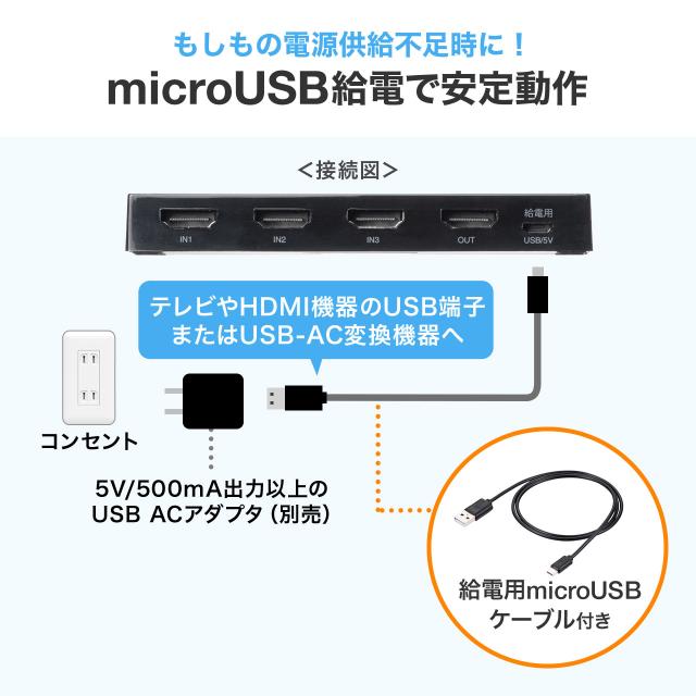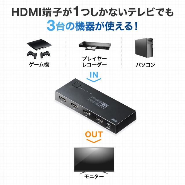 ●3台のHDMI機器を切り替えて、1台のディスプレイやプロジェクターに出力できます。●4K/60Hz対応。高精細かつ動きの滑らかな映像を入出力できます。