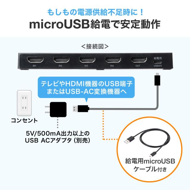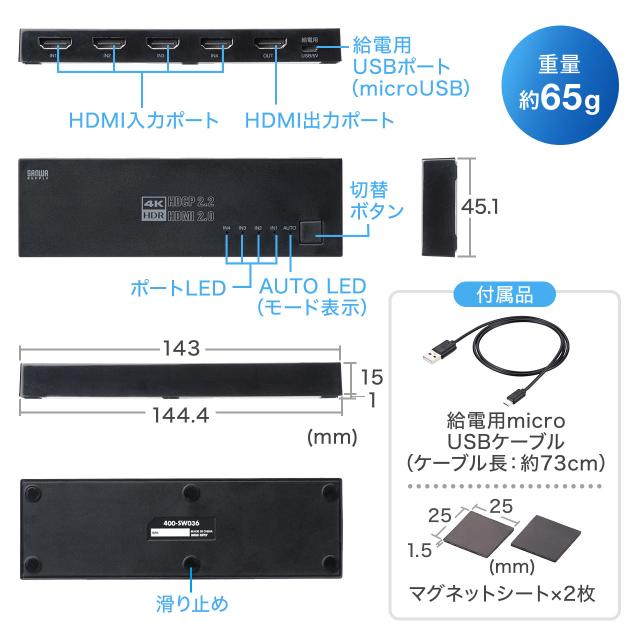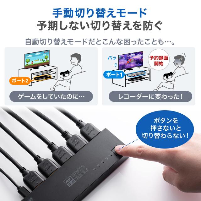 ●4台のHDMI機器を切り替えて、1台のディスプレイやプロジェクターに出力できます。●4K/60Hz対応。高精細かつ動きの滑らかな映像を入出力できます。