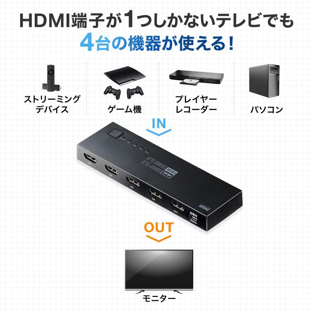 ⇒ご購入の前にご確認下さいテレビ・モニターのHDMI端子の不足を解消。4台の機器を切り替えて、1台のテレビに出力できるHDMIセレクター。高精細かつ動きが滑らかな4K/60Hz映像、明暗差が広い HDR映像に対応。【WEB限定商品】
