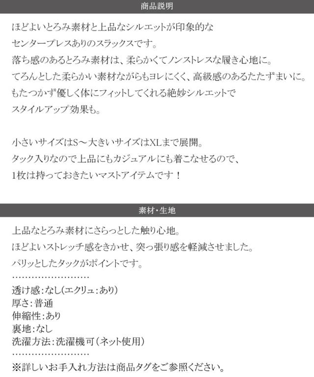 ![]() ![]() ![]() ![]() ![]() ![]() ![]() ![]() ![]() ![]() ![]() ![]() ![]() ![]() ![]() ![]() ![]() ![]() ![]() ![]() ★センタータック入り無地セミワイドパンツ(フルレングス)★ ほどよいとろみ素材と上品なシルエットが印象的なセンタープレスありのスラックスです。 落ち感のあるとろみ素材は、柔らかくてノンストレスな履き心地! 透けない生地でストレッチも効いているので、 普段デニムやスキニーが苦手という方にもおススメな、 ヘビロテ必至のイージーパンツです。 ウエストタックのきれいな縦落ちシルエットが スッキリした女性らしい腰回りを演出してくれます♪ 股上深めのハイウエストだからトップスをインしてもキレイに決まる! どこまでも上品で大人可愛いルーズ感は、てろんとした優しい素材ならでは。 レビュー商品の評価: