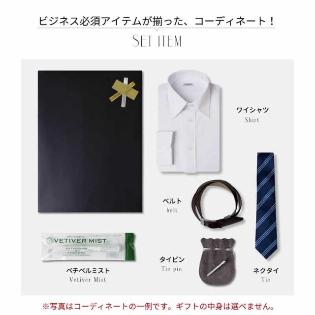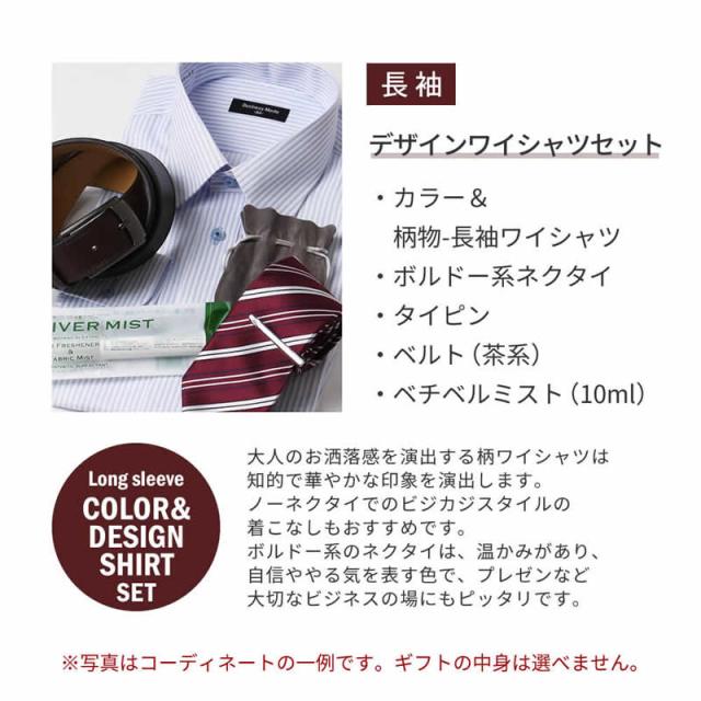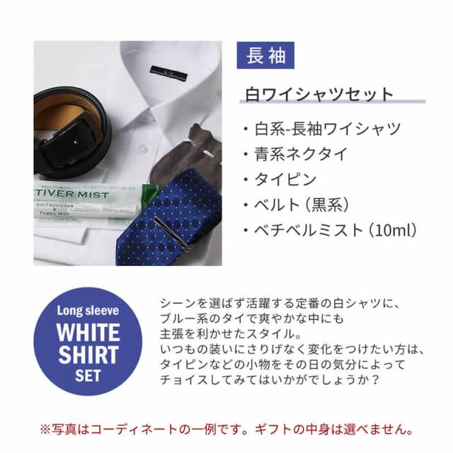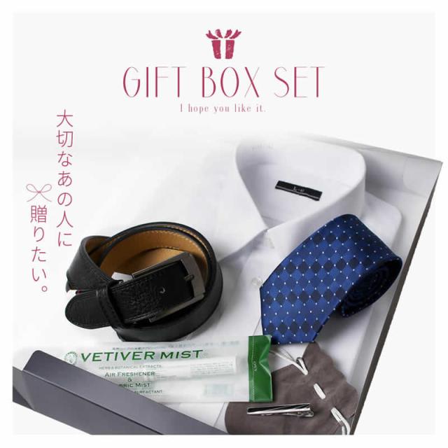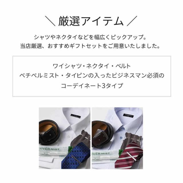 ワイシャツ1点・ネクタイ1点・ベルト1点・タイピン1点・ベチベルミスト10ml1点+ギフトボックス