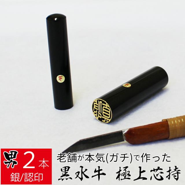 印鑑 はんこ 銀行印 黒水牛 2本セット ケース無し 印面ゴールド 実印 認印 個人印 ハンコ 仕事 職場 12mm 15mm 10年保証
