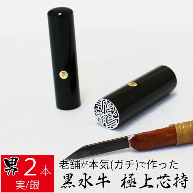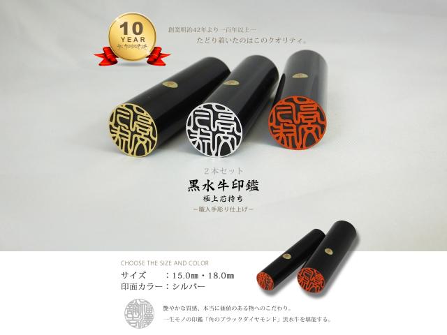 印鑑 はんこ 銀行印 黒水牛 2本セット ケース無し 印面シルバー 実印 認印 個人印 ハンコ 仕事 職場 15mm 18.0mm 10年保証